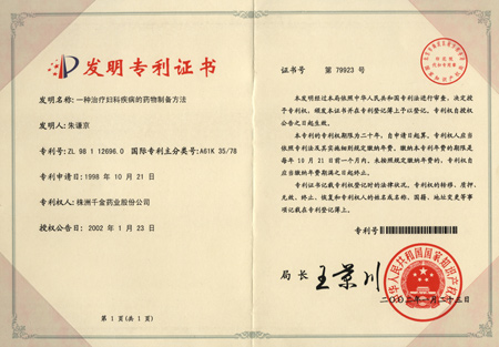 婦科千金片發(fā)明專利證書